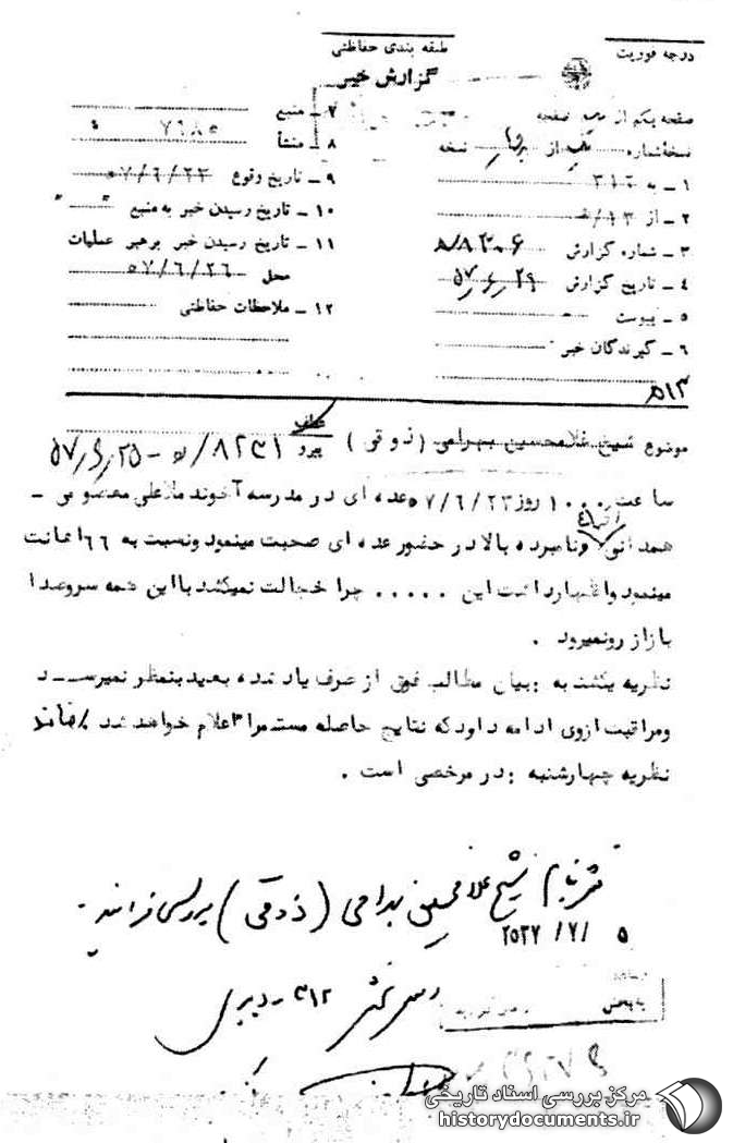 ساعت ۱۰ روز 23 /6 /57 عدهای در مدرسه آخوند ملاعلی معصومی همدانی اجتماع و نامبرده بالا در حضور عدهای صحبت مینمود و نسبت به 66 اهانت مینمود و اظهار داشت این............ چرا خجالت نمیکشد با این همه سر و صدا باز از رو نمیرود.