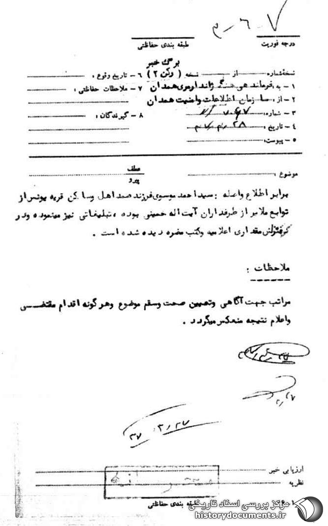 برابر اطلاع واصله: سید احمد موسوی فرزند صمد اهل و ساکن قریه یونس از توابع ملایر از طرفداران آیتالله خمینی بوده، تبلیغاتی نیز مینموده و در منزلش مقداری اعلامیه و کتب مضره دیده شده است.