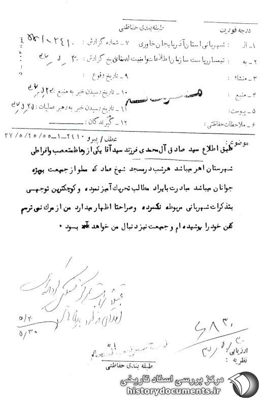 طبق اطلاع سیدصادق آلمحمدی فرزند سید آقا یکی از وعاظ متعصب و افراطی شهرستان اهر میباشد. هر شب در مسجد شیخ عماد که مملو از جمعیت به ویژه جوانان میباشد مبادرت به ایراد مطالب تحریکآمیز نموده و کوچکترین توجهی به تذکرات شهربانی مربوطه نکرده و صراحتاً اظهار میدارد من از مرگ نمیترسم کفن خود را پوشیدهام و جمعیت نیز دنبال من خواهد بود.