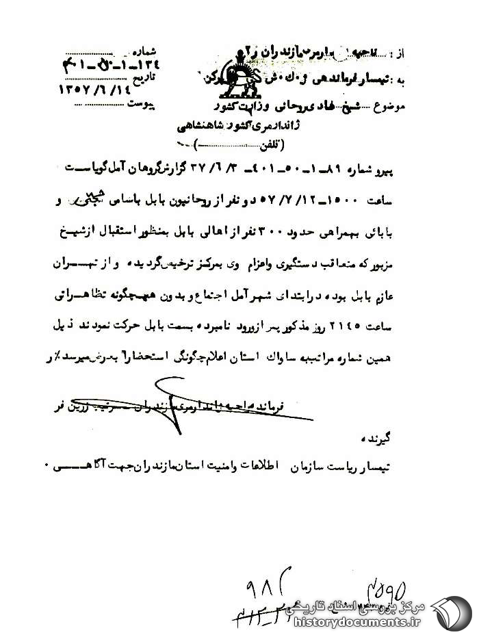 پیرو شماره 89- 1 – 50 – 401 – 3 / 6 / 37 گزارش گروهان آمل گویاست ساعت 1500 12 /7 /57 دو نفر از روحانیون بابل به اسامی حجتی و بابائی به همراهی حدود 300 نفر از اهالی بابل به منظور استقبال از شیخ مزبور که متعاقب دستگیری و اعزام وی به مرکز ترخیص گردیده و از تهران عازم بابل بوده در ابتدای شهر آمل اجتماع و بدون هیچگونه تظاهراتی ساعت 2145 روز مذکور پس از ورود نامبرده به سمت بابل حرکت نمودند. ذیل همین شماره مراتب به ساواک استان اعلام، چگونگی استحضاراً به عرض میرسد. ر