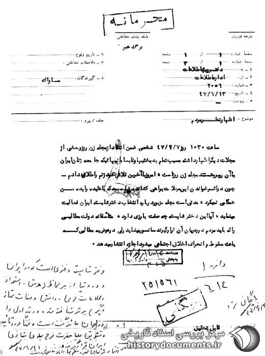 ساعت 1030 روز 7 /7 /47 شخصی ضمن انتقاد از مجله زن روز و بعضی از مجلات دیگر اظهار داشته: مسبب تمام بدبختیها و نابسامانی هایی که جامعه زنان ایران با آن روبرو هستند، مجله زن روز است، امروز با آخرین تلاش خود زنم را طلاق دادم چون در اثر خواندن این مجلات به راهی کشانده شده بود که با عقیده و ایده من همگامی نمیکرد. مدتی است مجله مزبور درباره انتخاب دختر شایسته ایران فعالیت مینماید، آیا این دختر شایسته چه صفت بارزی دارد، متأسفانه دولت مطالبی را که باید مردم در جریان آن قرار گیرند سانسور مینماید ولی در عوض به مطالبی که باعث سقوط و انحراف اخلاق اجتماعی میشود اجازه انتشار میدهد.