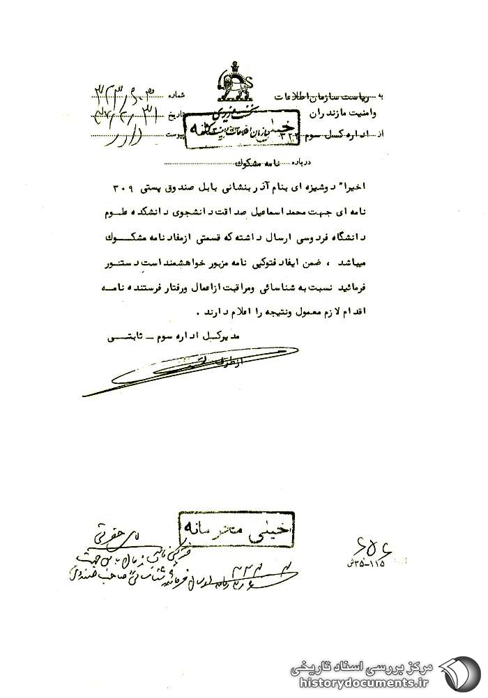 اخیراً دوشیزهای به نام آذر به نشانی بابل، صندوق پستی 309، نامهای جهت محمداسماعیل صداقت دانشجوی دانشکده علوم دانشگاه فردوسی ارسال داشته که قسمتی از مفاد نامه مشکوک میباشد، ضمن ایفاد فتوکپی1 نامه مزبور خواهشمند است دستور فرمائید نسبت به شناسائی و مراقبت از اعمال و رفتار فرستنده نامه اقدام لازم معمول و نتیجه را اعلام دارند. نامهی