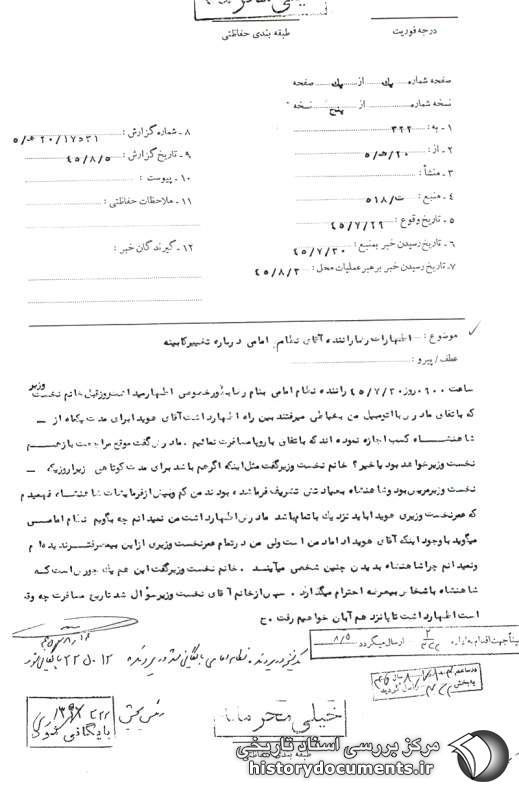 ساعت 0900 روز 30 /7 /45 راننده نظام امامی به نام رضا بهطور خصوصی اظهار میداشت: روز قبل خانم نخستوزیر که به اتفاق مادرش با اتومبیل من به خیاطی میرفتند، بین راه اظهار داشت: آقای هویدا برای مدت یک ماه از شاهنشاه کسب اجازه نمودهاند که به اتفاق به اروپا مسافرت نماییم. مادرش گفت موقع مراجعت بازهم نخستوزیر خواهد بود یا خیر؟ خانم نخست وزیر گفت: مثل اینکه اگر هم باشد برای مدت کوتاهی، زیرا روزی که نخستوزیر مریض بود شاهنشاه به عیادتش تشریف فرما شده بودند من کم و بیش از فرمایشات شاهنشاه فهمیدم که عمر نخستوزیری هویدا باید نزدیک به اتمام باشد. مادرش اظهار داشت: من نمیدانم چه بگویم، نظام امامی میگوید با وجود اینکه آقای هویدا داماد من است ولی من در تمام عمر نخستوزیری از این بیمصرفتر ندیدهام و نمیدانم چرا شاهنشاه به دیدن چنین شخصی میآیند. خانم نخستوزیر گفت: این هم یک جورش است که شاهنشاه به اشخاص بیعرضه احترام میگذارد. سپس از خانم نخستوزیر سؤال شد تاریخ مسافرت چه وقت است؟ اظهار داشت: تا پانزدهم آبان خواهیم رفت.