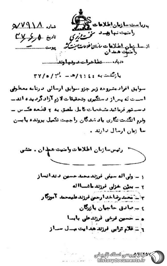 سوابق افراد مشروحه زیر جزو سوابق ارسالی در نامه معطوفی است که پس از دستگیری و تحقیقات لازم آزاد گردیدهاند دستور فرمائید مشخصات کامل ملصق به ۲ قطعه عکس و فرم انگشت نگاری یادشدگان را جهت تکمیل پرونده به این سازمان ارسال دارند.