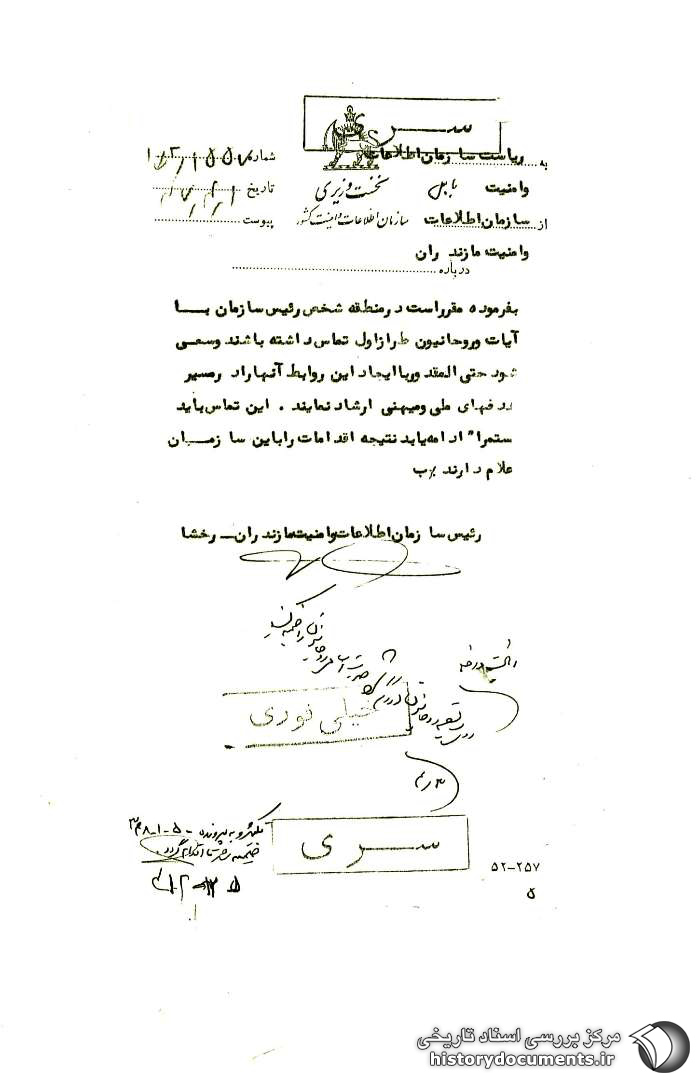 به فرموده مقرر است در منطقه شخص رئیس سازمان با آیات و روحانیون طراز اول تماس داشته باشند و سعی شود حتیالمقدور با ایجاد این روابط آنها را در مسیر هدفهای ملّی و میهنی ارشاد نمایند. این تماس باید مستمراً ادامه یابد. نتیجه اقدامات را به این سازمان اعلام دارند1. ب