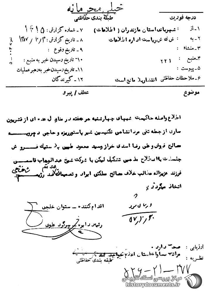 اطلاع واصله حاکیست شبهاى چهارشنبه هر هفته در منازل عدهاى از قشریون سارى از جمله تقى مردانشاهى تکنیسین شیر پاستوریزه و حاجى دهرویه مصالح فروش و علىرضا اسدى خراز و سیدمحمود طیبى پلاستیک فروش جلسات به اصطلاح مذهبى تشکیل لیکن با شرکت شیخ عبدالوهاب قاسمى فرزند عزیزاللّه مطالب خلاف مصالح مملکتى ایراد و تصمیماتى جهت اقدام ضدرژیم شاهنشاهى اتخاذ مىگردد%