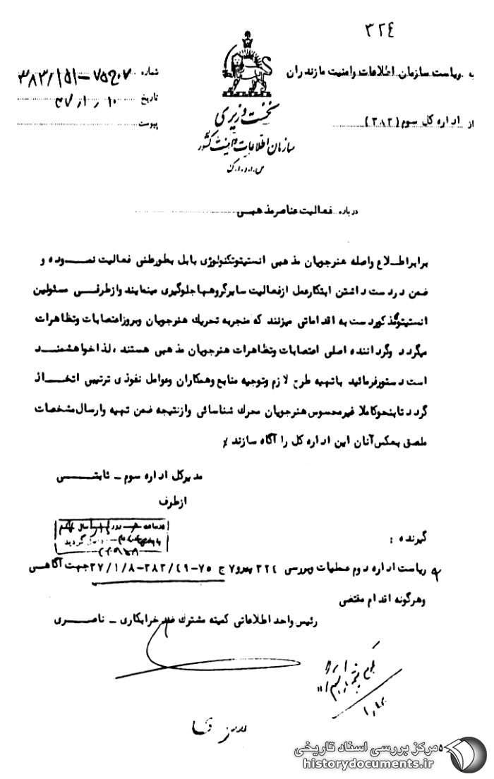 گیرنده: ریاست اداره دوم عملیات و بررسی 324 پیرو 7 ج 75- 49 /383- 8 /1 /37 جهت آگاهی و هرگونه اقدام مقتضی. رئیس واحد اطلاعاتی کمیته مشترک ضدخرابکاری. ناصری