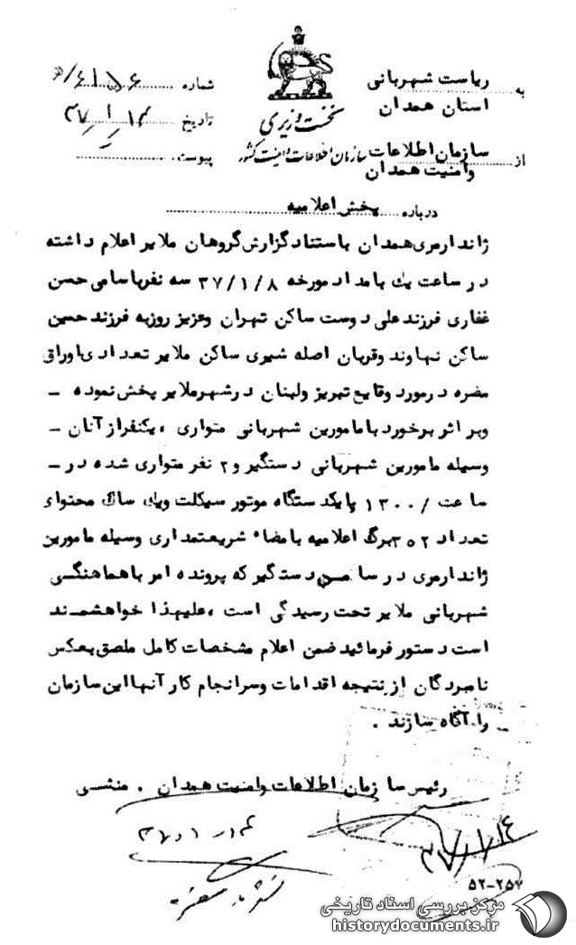 ژاندارمری همدان به استناد گزارش گروهان ملایر اعلام داشته در ساعت یک بامداد مورخه 8 /1 /37 سه نفر به اسامی حسن غفاری فرزند علی دوست ساکن تهران و عزیز روزبه فرزند حسین ساکن نهاوند و قربان اصله شیری ساکن ملایر تعدادی اوراق مضره در مورد وقایع تبریز و لبنان در شهر ملایر پخش نموده و بر اثر برخورد با مأمورین شهربانی متواری، یک نفر از آنان وسیله مأمورین شهربانی دستگیر و ۲ نفر متواری شده در ساعت ۱۳ با یک دستگاه موتورسیکلت و یک ساک محتواری تعداد ۳۵۲ برگ اعلامیه به امضاء شریعمتداری وسیله مأمورین ژاندارمری در سامن1 دستگیر که پرونده امر با هماهنگی شهربانی ملایر تحت رسیدگی است، علیهذا خواهشمند است دستور فرمائید ضمن اعلام مشخصات کامل مصلق به عکس نامبردگان از نتیجه اقدامات و سرانجام کار آنها این سازمان را آگاه سازند.