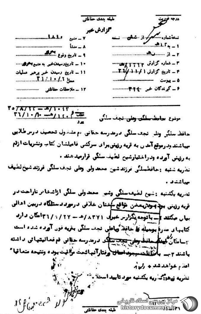 نظریه یکشنبه: شیخ لطیف سلگی و شیخ محمدولی سلگی از اشخاص ناراحت در قریه رزینی بوده و در بعضی مواقع سخنان خلافی در مورد دستگاه در بین اهالی بیان میکنند. ۲- با توجه به گزارش خبری 8371/ ه- 27 /9 /36 امکان دارد کتابهای مضره به وسیله حافظ و یا علی نجف سلگی به قریه فوق آورده شده است. ۳- امکان دارد حافظ و علی نجف سلگی در مدرسه حقانی قم فعالیتهایی داشته باشند 3- با امکانات موجود اعمال و رفتار آنها تحت مراقبت بوده و نتیجه متعاقباً اعلام خواهد شد. دادوند.