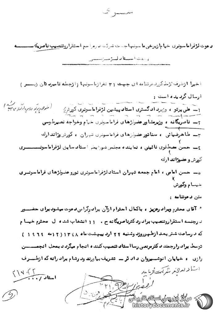 اخیراً از طرف لژ مذکور دعوتنامهای جهت 31 نفر از ماسونها (از جمله نامبردگان زیر) ارسال گردیده است: