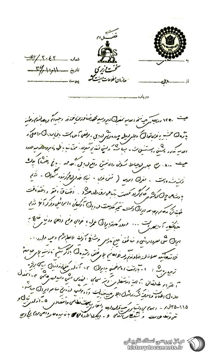 ساعت 1230 روز جاری یک نسخه اعلامیه به مضمون زیر [به] وسیله محمدرضا فرزین فرزند وجیهالله گروهبان سوم وظیفه پادگان جمشیدیه غربی تهران که برای دیدار پدر و مادرش در بابل به مرخصی آمده است به این سازمان واصل که اعلامیه مذکور ماشینی و استنسیل شده میباشد که پستی تقدیم میگردد. ضمناً بنا به اظهار نامبرده اعلامیه حدود ساعت 800 صبح جاری در حیاط مسکونی والدینش واقع در بابل- گله محله- باغ احتشام- پلاک 5 ریخته شده است. مضمون اعلامیه (متن عربی- به نام خدای درهم کوبنده ستمگران- رژیم پادشاهی چون در کشوری حاکم گردد مملکت به تباهی سوق داده میشود. اختناق، فقر و اختلافات طبقاتی که حاکم بر جامعه ایران است نتیجه حکومت اربابان آمریکایی، اسرائیلی و نوکر آنها رژیم جنایتکار آریامهری است... ورود کارتر به ایران همراه با خرابی وضع داخلی و دنیای خارج به ایران مثل مصر و اسرائیل و مناطق خلیج فارس و شاخ آفریقا رابطه شوم و پلید دارد... خواستههایی که مصرّانه از خداوند بزرگ خواهانیم برای خلق رشیدمان بازگو میکنیم تا زمینه برای جامعه توحیدی میباشد: 1- بازگشت امام خمینی به ایران 2- آزادی کلّیه زندانیان سیاسی به ویژه آیتالله طالقانی، آیتاللهمنتظری، دکتر سحابی، مهندس میثمی و سیدمهدی هاشمی 3- انحلال سازمان اطلاعات و امنیت کشور که مسئول اجرای کلّیهی جنایات و آدمکشیها در تاریخ ایران میباشد. 4- اعلام بیاعتباری کلّیه قراردادهای استعماری و سیاست نظامی و اقتصادی 5- آزادی بیان و قلم و تظاهرات و میتینگهای اسلامی 6- ایجاد دادگاهی با نمایندههای واقعی مردم رنج دیده برای محاکمه 66 خائن و هیئت حاکمه و دیگر نوکران سرسپرده آمریکا 7-... و سایر اهداف انسانی برای رسیدن به جامعه توحیدی اسلامی، درود بر امام خمینی و مجاهدین راستین خلقها، مرگ بر کارتر و نوکران آنها در منطقه، هرچه مستحکمتر باد اتحاد و مبارزات ضد امپریالیزم و صهیونیسم مسلمانان جهان.