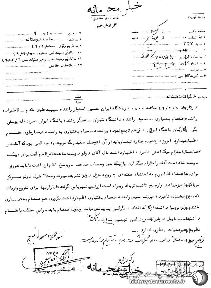 در تاریخ 5 /2 /49 ساعت 0800 در باشگاه ایران حسین استوار راننده سپهبد علوی مقدم، کاظمزاده راننده صمصام بختیاری، محمود راننده دانشگاه تهران، عسگر راننده باشگاه ایران، نصرتاله یوسفی یکی از کارکنان باشگاه ایران به دور هم تجمع نموده و راننده صمصام بختیاری به راننده تیمسار علوی مقدم اظهار میدارد امروز در تشییع جنازه تیمسار پایدار آن اتومبیل سفید رنگ مربوط به چه کسی بود که آن قدر به صاحبش احترام میگذاشتی نامبرده اظهار داشت مال آقای دولو دوست شاهنشاه. کاظم گفت برای اینکه دوست شاه است آنقدر احترام میگذاری یا اینکه حق و حساب میدهد در پاسخ اظهار داشت ما باید هر روز برای شاهنشاه غذا ببریم و شاهنشاه هفتهای 2 روز به منزل دولو تشریف میبرند و ضمناً منزل دولو مرکز تریاکیها نیز میباشد و از صبح تا شب تریاک روبراه است از رئیس شهربانی گرفته تا بازاریها برای تفریح و تریاک کشیدن به منزل نامبرده میروند سپس راننده صمصام بختیاری اظهار داشت یک روزی هم صمصام بختیاری مانند دولو برو بیا داشت از کار که افتاد دیگر کسی به دیدنش نیامد و به قول صمصام باید در این مملکت یا مقام داشت یا پول در غیر این صورت کسی توجهی ندارد. تاکستانی