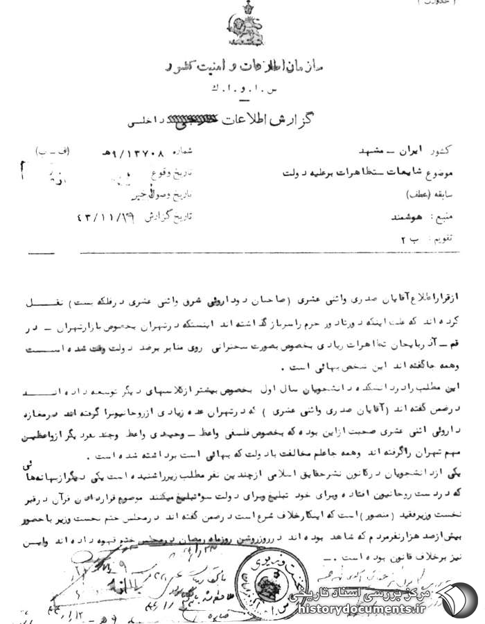 از قرار اطلاع، آقایان صدری و اثنیعشری (صاحبان دو[شرکت] داروئی شرق و اثنیعشری در فلکه بست) نقل کردهاند که: علت اینکه دورتادور حرم را سرباز گذاشتهاند، در تهران بخصوص بازار تهران ـ در قم- آذربایجان، تظاهرات زیادی، بخصوص به صورت سخنرانی روی منابر، برضد دولت وقت شده است و همه جا گفتهاند: این شخص بهائی است.