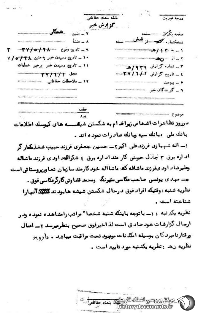 ١- اله شهبازی فرزند علیاکبر ۲- حسین جعفری فرزند حبیب شغل کارگر اداره برق ۳- جلال حسنی کارمند اداره برق 4- شکراله داودی فرزند ماشااله و علیرضا داودی فرزند ماشااله که ماشااله خود کارمند تعاون روستایی است. 5- مهدی یونسی صاحب عکاسی شبرنگ و محمد قضاوتی کارگر عکاسی فوق.
