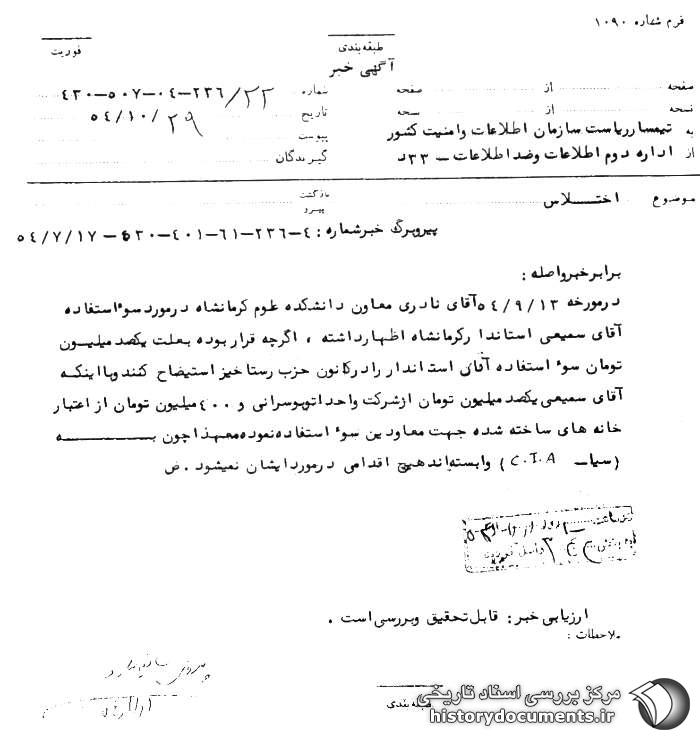 در مورخه 13 /9 /54 آقای نادری، معاون دانشکده علوم کرمانشاه، در مورد سوءاستفاده آقای سمیعی، استاندار کرمانشاه، اظهار داشته: اگرچه قرار بوده به علت یکصد میلیون تومان سوءاستفاده، آقای استاندار را در کانون حزب رستاخیز استیضاح کنند و با اینکه آقای سمیعی یکصد میلیون تومان از شرکت واحد اتوبوسرانی و 400 میلیون تومان از اعتبار خانههای ساخته شده جهت معاودین سوءاستفاده نموده، معهذا چون به ( سیا ـ C. I. A) وابستهاند، هیچ اقدامی در مورد ایشان نمیشود.