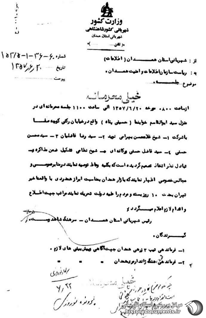 از ساعت ۸ مورخه 20 /6 /1357 الی ساعت ۱۱ جلسه محرمانهای در منزل سید ابوالقاسم خواب نما (حسینیپناه) واقع در خیابان رکنی کوچه صفا با شرکت ۱- شیخ غلامحسن بهرامی نوید ۲- سید رضا فاضلیان 3- سید محسن حسنی 4-سید فاضل حسنی ورکانه ۵- شیخ نظامی تشکیل ضمن مذاکره و تبادل نظر اتخاذ تصمیم گردیده است که به کلیه وعاظ توصیه نمایند در منابر عمومی و مجالس خصوصی اظهار نمایند که بازار همدان به مناسبت ابراز همدردی با واقعه اخیر تهران به مدت ۱۰ روز بسته و مردم را علیه دولت تحریک نمایند مراتب جهت اطلاع و اقدام لازم اعلام میگردد.