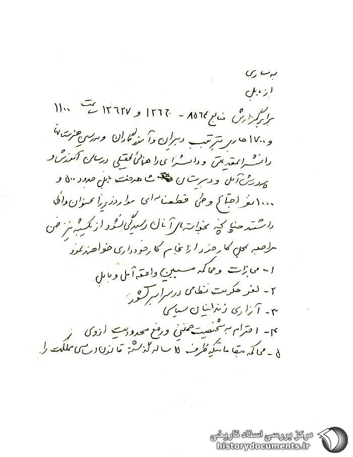 1- مجازات و محاکمه مسبّبین واقعه آمل و بابل؛ 2- لغو حکومت نظامی در سراسر کشور؛ 3- آزادی زندانیان سیاسی؛ 4- احترام به شخصیت خمینی و رفع محدودیت از وی؛ 5- محاکمه مقاماتی که ظرف 15 ساله گذشته قانون اساسی مملکت را و هر دو در زمینههای سیاسی و مذهبی منطبق با خط مشی مذهبیها فعّال بودهاند و به مهدیّهی بابل نیز زیاد رفتوآمد مینمودند و همآنجا شخصی به نام صابریان (بین مذهبیهای بابل به عنوان یک تئوریسین مورد قبول است و حدود 2 سال دارد) و دوست وی که دانشجوی پزشکی اصفهان و به اتهام اقدام علیه امنیت کشور به دو سال زندان محکوم شده است مرتبط است.
