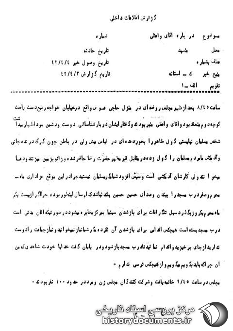 ساعت 8:45 بعدازظهر مجلس روضهای در منزل حاجی عوض واقع در خیابان خواجه ربیع دست راست کوچه دوم منعقد بود و آقای واعظی منبر بودند و گفتار ایشان درباره شناسایی دوست و دشمن بود اظهار میداشت شخص مسلمان نبایستی گول ظاهر را بخورد. عدهای در لباس میش ولی در باطن چون گرگ درنده جانی و آدمکش، ما مردم مسلمان را گولزده در مقابل قبر مطهر حضرت رضا[(ع)] حاضر شده و زانو به زمین میزنند و دعا میخوانند ولی کارشان آدمکشی است و سپس افزود شما مگر مسلمان نیستید؟ چرا در این موقع عزاداری ماه محرم و صفر درب مسجد را ببندند1 و صدای حسین حسین بلند نباشد کدام سال اینطور بوده چرا اگر از بیست و یکم ماه محرم یک روز بگذرد سیل تلگرافات برای باز شدن سینما به مرکز مخابره میشود درصورتیکه الآن مدتی است درب مسجد بسته است هیچکس اقدامی برای باز شدن آن نکرده مگر شما نماز نمیخوانید و نماز جماعت را دوست ندارید از جای برخیزید و اقدامی نمایید تا درب مسجد باز شود و در پایان گفت خدایا خودت شاهدی که من آنچه2 را که باید بگویم میگویم و از هیچکس ترسی ندارم.