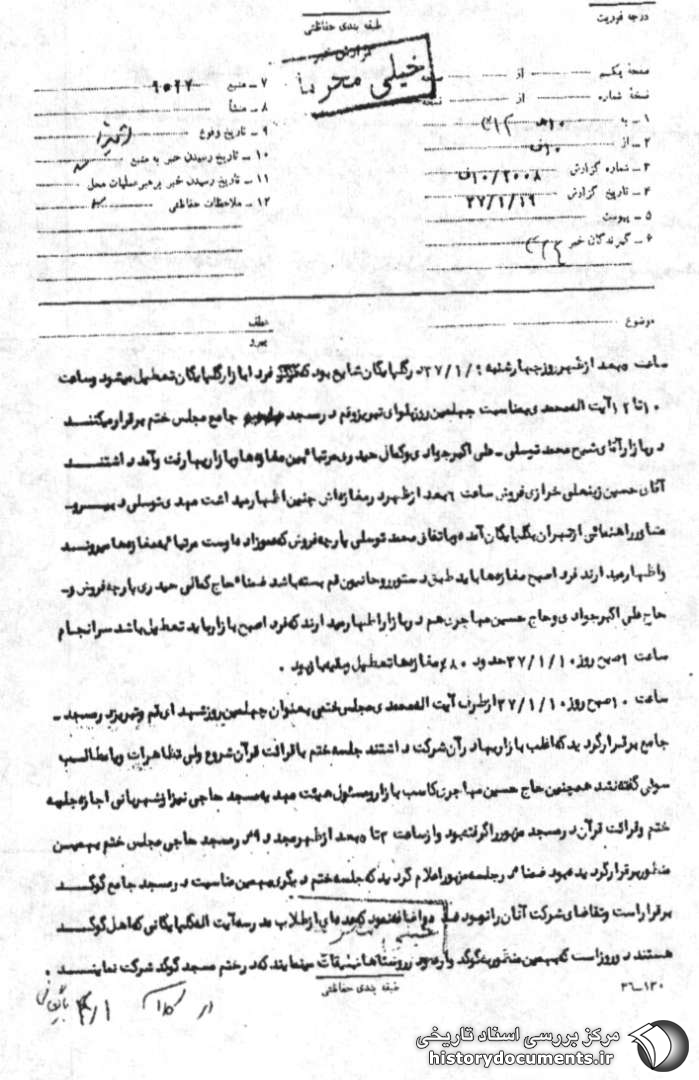 ساعت ۱۰ صبح روز 1 /1 /37 از طرف آیتالله محمدی مجلس ختمی به عنوان چهلمین روز شهدای قم و تبریز در مسجد جامع بر قرار گردید که اغلب بازاریها در آن شرکت داشتند جلسه ختم با قرائت قرآن شروع ولی تظاهرات و یا مطالب سوئی گفته نشد. همچنین حاج حسین مهاجری کاسب بازار و مسئول هیئت مهدیه مسجد حاجی نیز از شهربانی اجازه جلسه ختم و قرائت قرآن در مسجد مزبور را گرفته بود و از ساعت ۳ تا ۵ بعداز ظهر مجدداً در مسجد حاجی مجلس ختم به همین منظور برقرار گردیده بود. ضمناً در جلسه مزبور اعلام گردید که جلسه ختم دیگری به همین مناسبت در مسجد جامع گوگد برقرار است و تقاضای شرکت آنان را نموده و اضافه نمود که عدهای از طلاب مدرسه آیتالله گلپایگانی که اهل گوگد هستند دو روز است که به همین منظور به گوگد وارد و در روستاها تبلیغات مینمایند که در ختم مسجد گوگد شرکت نمایند. با نظارت مأموران شهربانی مسئلهای به وجود نیامده است.