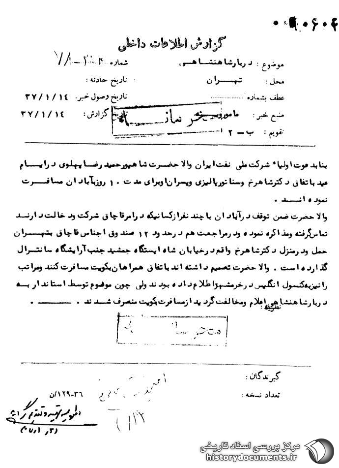 بنا به دعوت اولیاء شرکت ملی نفت ایران والاحضرت شاپور حمیدرضا پهلوی در ایام عید به اتفاق دکتر شاهرخ و سناتور پالیزی و پسران او برای مدت 10 روز به آبادان مسافرت نمودهاند.