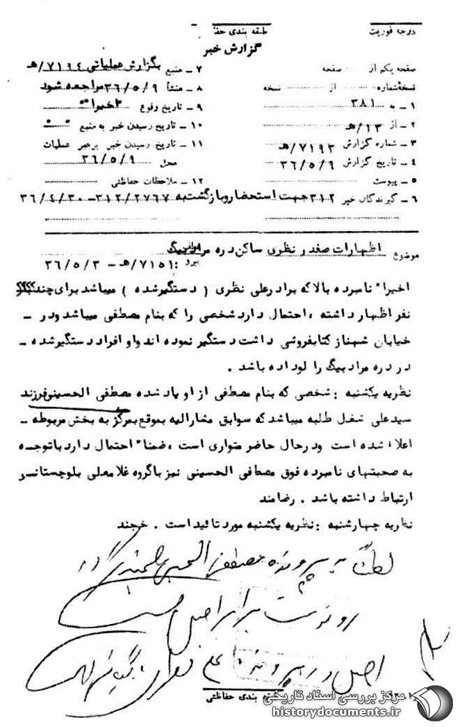 نظریه یکشنبه: شخصی که به نام مصطفی از او یاد شده مصطفى الحسینی فرزند سیدعلی شغل طلبه میباشد که سوابق مشارالیه به موقع به مرکز به بخش مربوط اعلام شده است و در حال حاضر متواری است، ضمناً احتمال دارد با توجه به صحبتهای نامبرده فوق مصطفى الحسینی نیز با گروه غلامعلی بلوچستانی ارتباط داشته باشند. رضامند