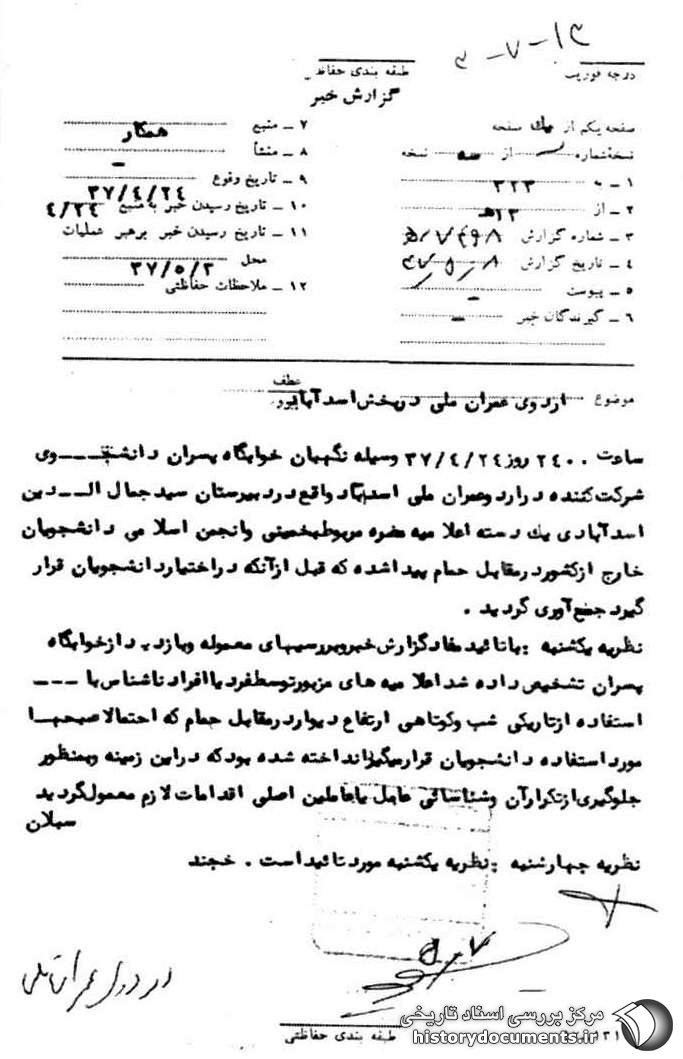 ساعت ۲4 روز 24 /4 /37 وسیله نگهبانان خوابگاه پسران دانشجوی شرکت کننده در اردو عمران ملی اسدآباد واقع در دبیرستان سید جمالالدین اسدآبادی یک دسته اعلامیه مضره مربوط به خمینی و انجمن اسلامی دانشجویان خارج از کشور در مقابل حمام پیدا شده که قبل از آنکه در اختیار دانشجویان قرار گیرد جمعآوری گردید.