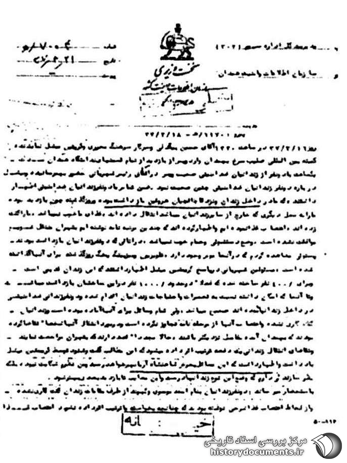 باستحضار میرساند: دو نفر زندانیان بنام امجد موسوی و کهوند از طرف مقامات زندان کتک کاری نشده و از لحاظ اعتصاب غذا شرحی نوشته بودند که چنانچه بخواسته ما ترتیب اثر داده نشود اعتصاب غذا خواهیم نمود (در مورد منتقلی آنها مخالفت شده است) در مورد جا و محل نگهداری آنان مقامات شهربانی به علت اینکه محل جداگانهای وجود ندارد از این لحاظ در داخل ندامتگاه بین سایر زندانیان نگهداری میشوند.1