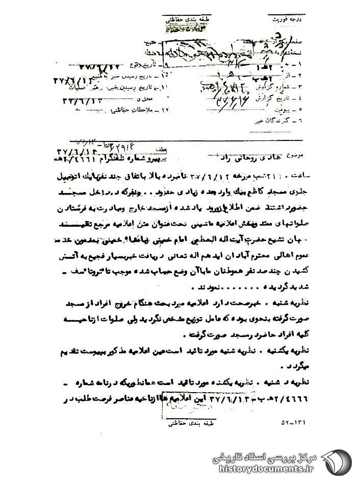 ساعت 2110 شب مورخه 12 / 6/ 37 نامبرده بالا به اتفاق چند نفر با یک اتومبیل جلوی مسجد کاظمبیک وارد و عدّه زیادی حدود 500 نفر که در داخل مسجد حضور داشتند ضمن اطلاع از ورود یادشده از مسجد خارج و مبادرت به فرستادن صلواتهای ممتد و پخش اعلامیه ماشینی تحت عنوان متن اعلامیه مرجع تقلید جهان تشیع حضرت آیتالله العظمی امام خمینی و به امضاء خمینی به مضمون خدمت عموم اهالی محترم آبادان ایدهم الله تعالی دریافت خبر بسیار فجیع به آتش کشیدن چندصد نفر هموطنان ما با آن وضع حسابشده موجب تأثر و تأسف شدید گردیده.....1 نمودند.