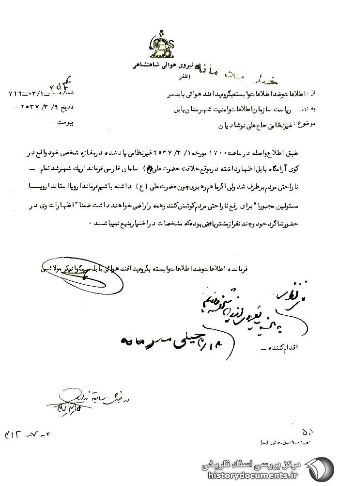 طبق اطلاع واصله در ساعت 1700 مورخه 1 /3 /2537 غیرنظامی یادشده در مغازه شخصی خود واقع در کوی آرامگاه بابل اظهار داشت در موقع خلافت حضرت علی(ع) سلمان فارسی فرماندار یک شهر شد تمام ناراحتی مردم برطرف شد ولی اگر ما هم رهبری چون حضرت علی(ع) داشته باشیم فرماندار و یا استاندار و یا مسئولین مجبوراً برای رفع ناراحتی مردم کوشش کنند و همه را راضی خواهند داشت ضمناً اظهارات وی در حضور شاگرد خود و چند نفر از مشتریانش بوده که مشخصات در اختیار منبع نمیباشد.
