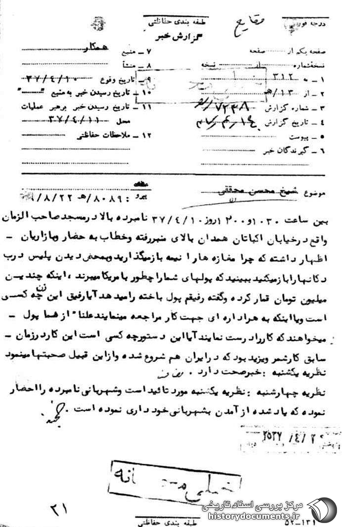 بین ساعت ۱۰:۳۰ و ۱۲ روز 10 /4 /37 نامبرده بالا در مسجد صاحبالزمان واقع در خیابان اکباتان همدان بالای منبر رفته و خطاب به حضار و بازاریان اظهار داشته که چرا مغازهها را نیمه باز میگذارید و به محض دیدن پلیس درب دکانها را باز میکنید ببینید که پولهای شما را چطور به آمریکا میبرند، این که چندین میلیون تومان قمار کرده و گفته رفیقم پول باخته را میدهد آیا رفیق این زن چه کسی است و یا اینکه به هر ادارهای جهت کار مراجعه مینمایند علناً از شما پول میخواهند که کار را درست نمایند آیا این دستور چه کسی است این کار در زمان سابق کار شمر و یزید بود که در ایران هم شروع شده و از این قبیل صحبتها مینمود.