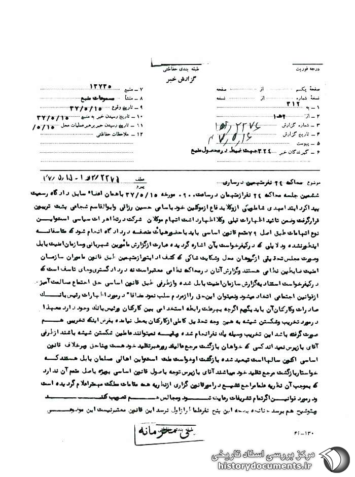 ششمین جلسه محاکمه 24 نفر از متهمان در ساعت 0900 مورخه 15 /5 /37 با همان اعضاء سابق دادگاه رسمیت پیدا کرد ابتدا مهدی شاملو یکی از وکلا به دفاع از موکلین خود به اسامی حسین رزاقی و ابوالقاسم شجاعی پشت تریبون قرار گرفت و ضمن تائید اظهارات قبلی وکلا اظهار داشت اتهام موکلان شرکت در تظاهرات سیاسی است و این نوع اتهامات طبق اصل 79 متمم قانون اساسی باید با حضور هیأت منصفه در دادگاه آنجام شود که متأسفانه اینطور نشد و دلایلی که در کیفرخواست به آن اشاره گردیده عبارت از گزارش مأمورین شهربانی و سازمان امنیت بابل و صورت مجلس تحقیقی از گروهان محل و شکایت شاکی که کشف آدابتور از متهمین، طبق قانون مأموران سازمان امنیت ضابطین نظامی هستند و گزارش آنان در محاکمه نظامی معتبر است نه در دادگستری و جای تأسف است که در کیفرخواست استناد به گزارش سازمان امنیت بابل شده و از طرفی طبق قانون اساسی حق اجتماع مسالمتآمیز از قوانین اجتماعی اتخاذ میشود و نمیتوان این حق را از مردم سلب نمود مضافاً در مورد اظهارات رئیس بانک صادرات و کارکنان آن باید بگویم اگرچه به هر علّت رابطه استخدامی بین کارکنان و رئیس بانک وجود دارد معهذا در مورد تخریب و شکستن شیشه به هیچ وجه تحقیق کاملی از کارکنان به عمل نیامده به فرض اینکه تخریبی هم صورت گرفته باشد این تخریب وسیله یک نفر انجام شده و بقیه نمیتوانند عاملین شکستن شیشه باشند از طرفی آقای بازپرس نمیداند کسی که خواهان بازگشت مرجع عالیقدر و رهبر تقلید خود هست و به ناحق و برخلاف قانون اساسی اکنون سالها است تبعید شده بازگشت او خواست ملّت است و این اهالی مسلمان بابل هستند که خواستار بازگشت مرجع تقلید خود میباشند آقای بازپرس توجه به اصول قانون اساسی به ویژه به اصل متمم آن ندارد که به موجب آن نظریه علما مراجع تشیع در امور قانونگذاری1 از نظریه همه مقامات مملکت مهمتر اعلام گردیده است و در مورد قوانین اگر تمام تشریفات رعایت شود و مجالس هم تصویب کنند و به توشیح هم برسد چنانچه به صحه این پنج نفر علما طراز اول نرسد این قانون معتبر نیست این موضوعی است که قانون اساسی میگوید وی افزود موکلین من که یکی کارآموز دانشسرای راهنمائی تحصیلی و دیگری سپاهی میباشد به جای تحصیل اکنون قریب سه ماه است که در زندان با قاچاقچی و قاتل بسر میبرند آنان صادقانه وقتی نزد بازپرس بیان کردهاند آقای حسین رزاقی صبح پنجشنبه مورخه 14 /2 /37 در شاهی بوده که به منظور اتمام کار شخصی به بابل مسافرت و در آن شهرستان با تظاهرات مردم بابل مواجه و از ترس مأمورین و اینکه مبادا در حین تیراندازی گلولهای به او اصابت و بیجهت جانش را از دست بدهد مبادرت به فرار مینماید که دستگیر میشود و ابوالقاسم شجاعی نیز که برای رفع خستگی و گردش محل اقامت خود را ترک و به ساری آمده بود با تظاهرات مردم مواجه و مشارالیه نیز دستگیر میگردد آقای بازپرس آیا نمیداند سلب حقوق اولیه افراد و رفتار بازپرس با متهمان موجب بدبینی آنان به طبقهی شریف قضات میشود موکلینی که در شهربانی مورد ضرب و شتم مأموران قرار گرفتهاند حداقل توقعشان از دادگاه این بوده که ضمن جلوگیری از رویه ناصواب و نادرست مأموران با توجه به دلایل موجود در پرونده برایشان قرار تأمین موافق صادر شود در هر صورت چون دلائلی جهت محکوم نمودن موکلین در پرونده وجود ندارد از قضات محترم دادگاه تقاضای حکم برائت را دارم.