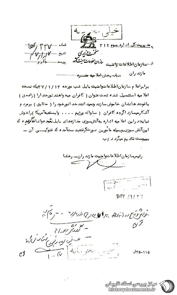 برابر اعلام سازمان اطلاعات و امنیت بابل شب مورخه 13 /1 /37 یک نسخه اعلامیه استنسیلشده تحت عنوان (کافران میخواهند نور خدا را (راه حق) با فوت دهانشان خاموش سازند و نمیدانند خدا نور خود را (حقایق) بر مردم آشکار میسازد اگرچه کافران (ساواک و رژیم... وابسته به آمریکا) را خوش نیاید. در این اعلامیه اشاره به آتشسوزی مغازههای بابل شده و اضافه گردیده که این آتشسوزی به وسیله مأمورین صورت گرفته به دست آمده که فتوکپی آن به پیوست تقدیم میگردد.