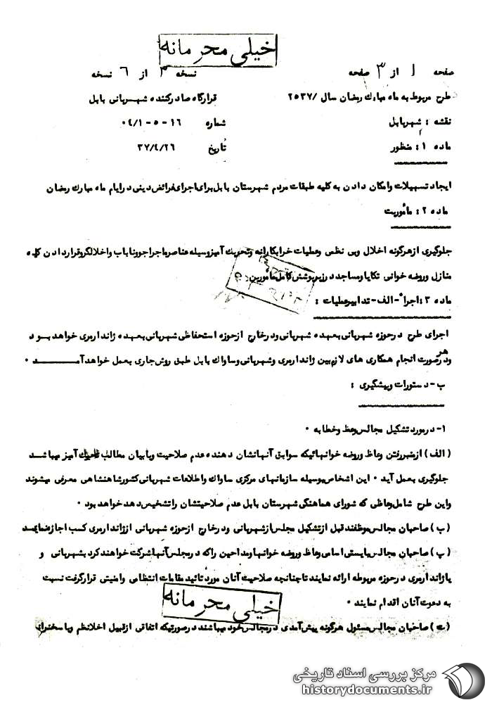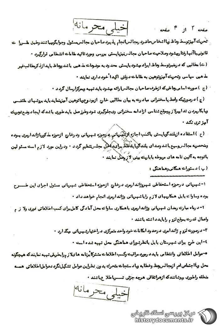 2- در ماه مبارک رمضان شهربانی و ژاندارمری با همکاری ساواک محل آمادگی کامل برای کسب اطلاعاتی فوری و لازم و اعمال قدرت به موقع لزوم را باید داشته باشند؛