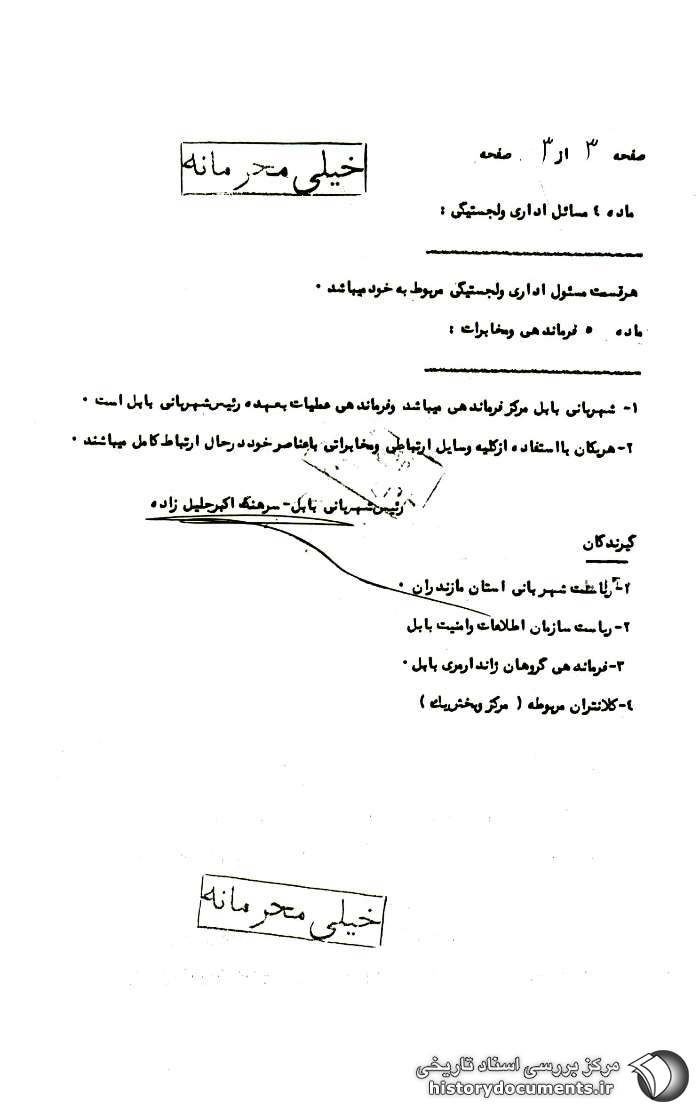 1- شهربانی در حوزه استحفاظی شهر و ژاندارمری در خارج از حوزه استحفاظی شهربانی مسئول اجرای این طرح بوده و ساواک بابل همکاریهای لازم را با شهربانی و ژاندارمری آنجام خواهد داد؛