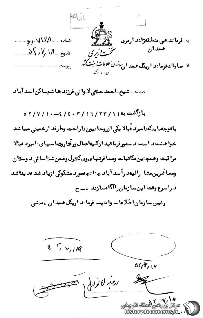 با توجه به این که نامبرده بالا یکی از روحانیون ناراحت و طرفدار خمینی میباشد خواهشمند است دستور فرمایید از کلیه اعمال و رفتار و تماسهای نامبرده بالا مراقبت و همچنین مکاتبات و مسافرتهای وی کنترل و ضمن شناسایی دوستان و معاشرین مشارالیه در اسدآباد چنانچه مورد مشکوکی از یادشده دیده شد در اسرع وقت این سازمان را آگاه سازند.