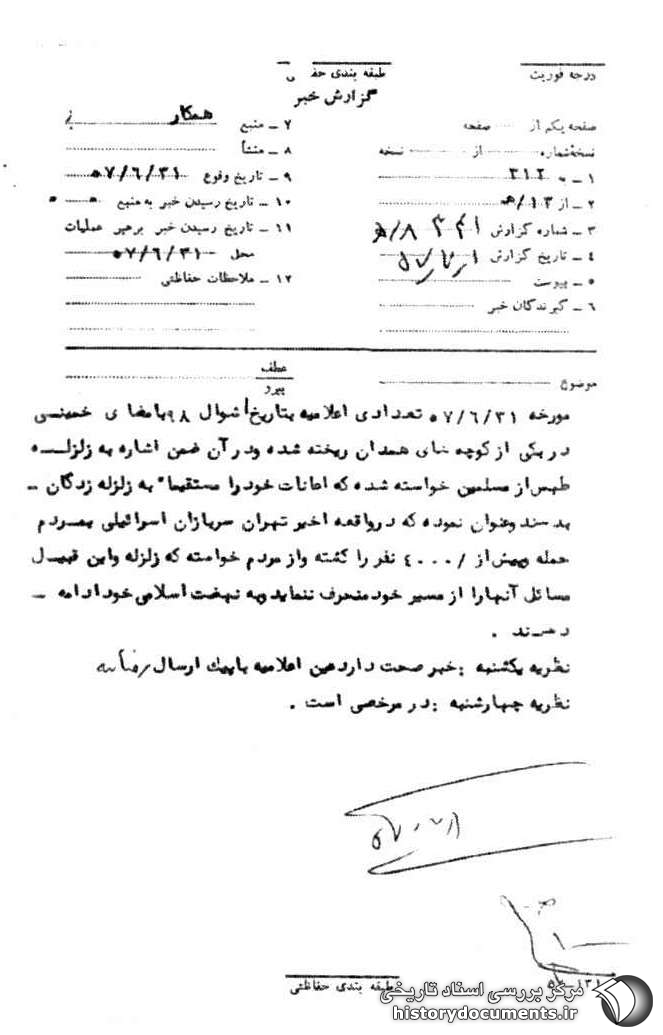 مورخه 31 /6 /57 تعدادی اعلامیه به تاریخ 1 شوال ۹۸ به امضای خمینی در یکی از کوچه های همدان ریخته شده و در آن ضمن اشاره به زلزله طبس از مسلمین خواسته شده که اعانات خود را مستقیماً به زلزله زدگان بدهند و عنوان نموده که در واقعه اخیر تهران سربازان اسرائیلی به مردم حمله و بیش از 4۰۰۰ نفر کشته و از مردم خواسته که زلزله و از این قبیل مسائل آنها را از مسیر خود منحرف ننماید و به نهضت اسلامی خود ادامه دهند/