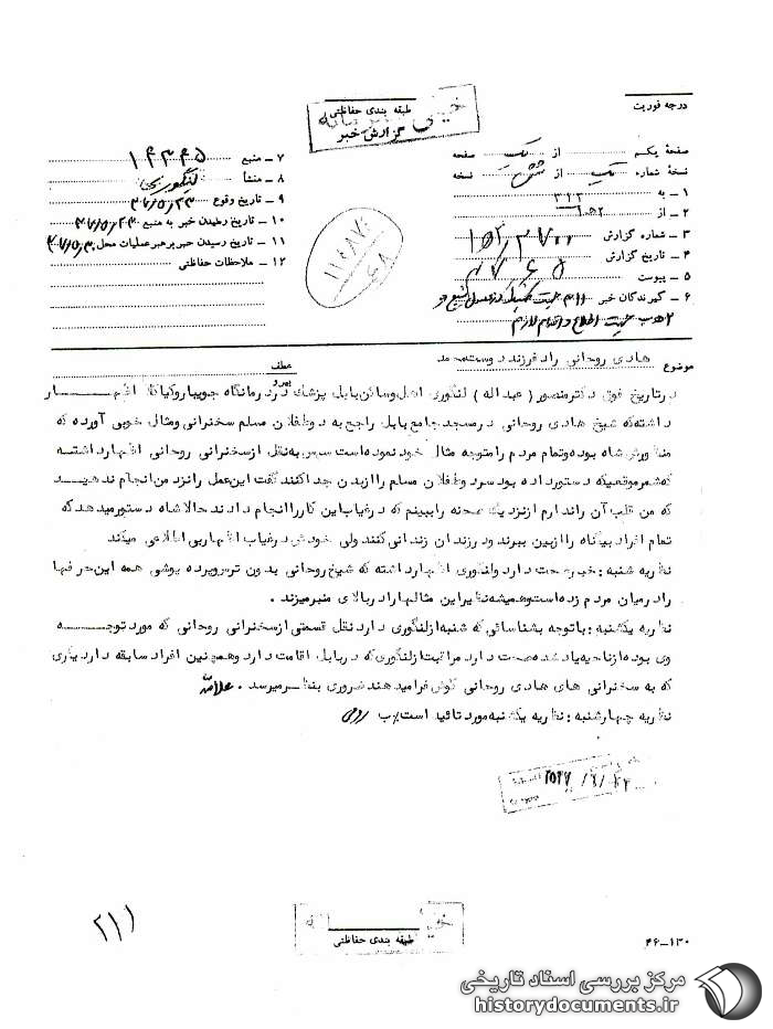 در تاریخ فوق دکتر منصور(عبدالله) لنگوری بابل پزشک در درمانگاه جویبار و کیاکلا اظهار داشت شیخ هادی روحانی در مسجد جامع بابل راجع به دو طفلان مسلم سخنرانی و مثال خوبی آورده که منظورش شاه بوده و تمام مردم را متوجه مثال خود نموده است سپس به نقل از سخنرانی روحانی اظهار داشت که شمر موقعی که دستور داده بود سر دو طفلان مسلم را از بدن جدا کنند گفت این عمل را نزد من آنجام ندهید که من قلب آن را ندارم از نزدیک صحنه را ببینم که در غیاب این کار را انجام دادند حالا شاه دستور میدهد که تمام افراد بیگناه را از بین ببرند و در زندان زندانی کنند ولی خودش در غیاب اظهار بیاطلاعی میکند.