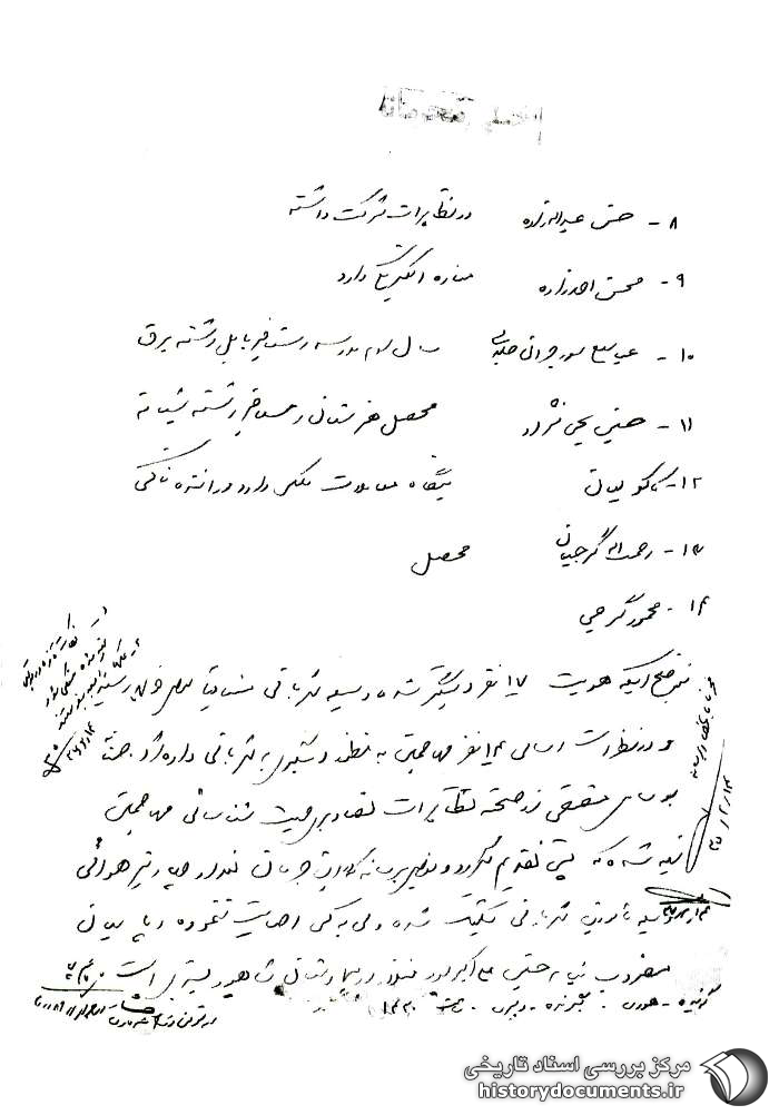 توضیح این که هویت 17 نفر دستگیر شده [به] وسیله شهربانی متعاقباً به عرض خواهد رسید و در نظر است اسامی 14 نفر مهاجمین به منظور دستگیری به شهربانی داده شود. ضمناً به وسایل مقتضی از صحنه تظاهرات تصاویری جهت شناسائی مهاجمین تهیه شده که پستی تقدیم میگردد و به عرض برساند که در این جریان تعداد چهار تیر هوائی [به] وسیلهی مأمورین شهربانی شلیک شده ولی به کسی اصابت ننموده و پاسبان مضروب به نام حسین علی اکبرپور فعلاً در بیمارستان شاهپور بستری است.