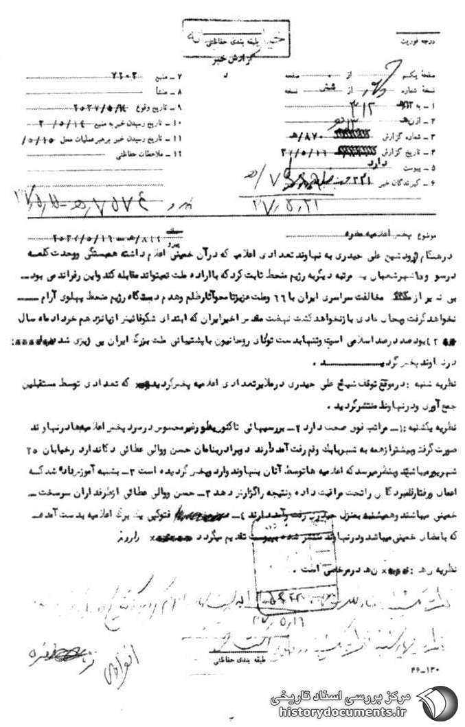 نظریه یکشنبه: ۱- مراتب فوق صحت دارد ۲ بررسیهایی که تاکنون به طور غیر محسوس در مورد پخش اعلامیهها در نهاوند صورت گرفت و بیشتر از همه به شهر بابک و قم رفت و آمد دارند دو برادر به نامهای حسن و والی عطایی دکاندار و خیابان ۲۵ شهریور میباشد و به نظر میرسد که اعلامیهها توسط آنان به نهاوند وارد و پخش گردیده است. ۳- به شنبه آموزش داده شد که اعمال و رفتار نامبردگان را تحت مراقبت قرار داده و نتیجه را گزارش دهد 4- حسن و والی عطایی از طرفداران سر سخت خمینی میباشند و همیشه به منزل حیدری رفت و آمد دارند. ۵- فتوکپی یک برگ اعلامیه به دست آمده که به امضای خمینی میباشد و در نهاوند منتشر شده به پیوست تقدیم میگردد. دادوند