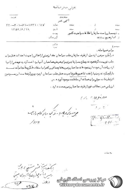 به: تیمسار ریاست سازمان اطلاعات و امنیت کشور شماره: 117ـ 1631ـ 61ـ 401ـ 430