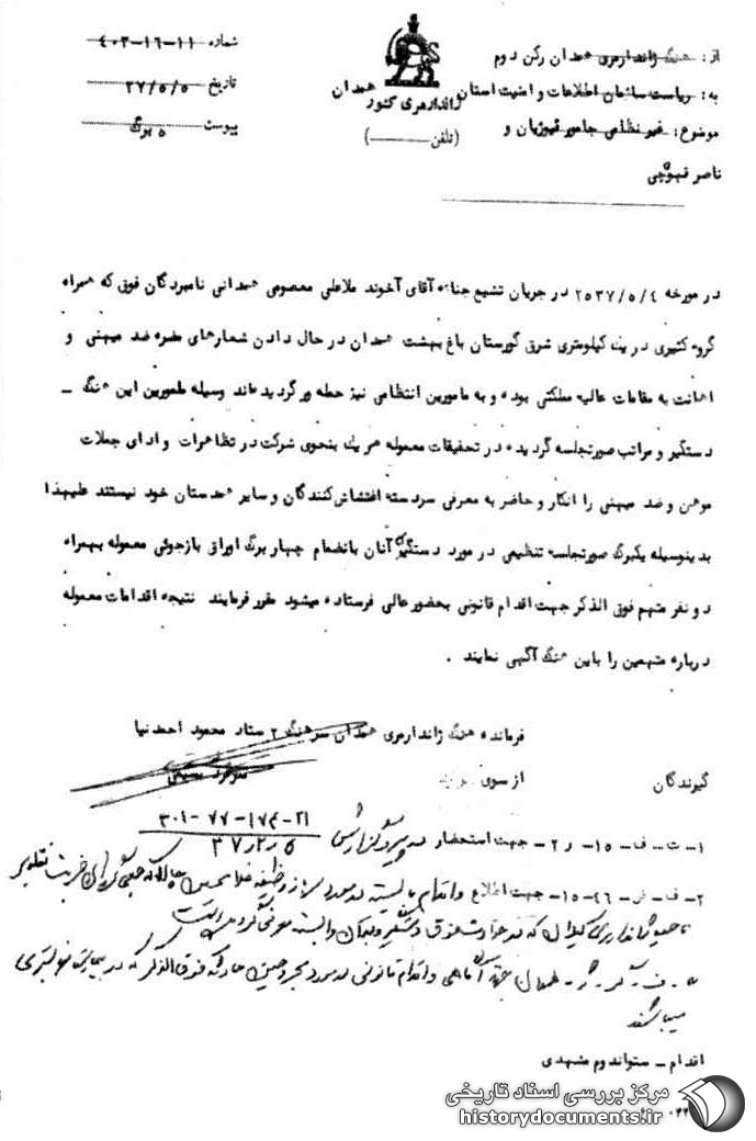 در مورخه 4 /5 /2537 در جریان تشیع جنازه آقای آخوند ملاعلی معصومی همدانی نامبردگان فوق که همراه گروه کثیری در یک کیلومتری شرق گورستان باغ بهشت همدان در حال دادن شعارهای ضد میهنی و اهانت به مقامات عالیه مملکتی بوده و به مأمورین انتظامی نیز حملهور گردیدهاند به وسیله مأمورین این هنگ دستگیر و مراتب صورت جلسه گردیده در تحقیقات معموله هریک به نحوی شرکت در تظاهرات و ادای جملات موهن و ضد میهنی را انکار و حاضر به معرفی سردسته اغتشاش کنندگان و سایر همدستان خود نیستند علیهذا بدینوسیله یکبرگ صورتجلسه تنظیمی در مورد دستگیری آنان به انضمام چهاربرگ اوراق بازجویی معموله به همراه دو نفر متهم فوقالذکر جهت اقدام قانونی بحضور عالی فرستاده میشود مقرر فرمایند نتیجه اقدامات معموله درباره متهمین را به این هنگ آگهی نمایند.