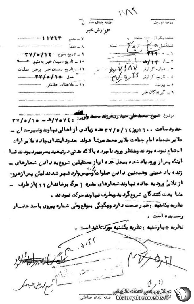 حدود ساعت 16 روز 14 /5 /37 عده زیادی از اهالی نهاوند و شهرستان ملایر منجمله امام جماعت ملایر محمد میرشاهولد حدود ابتدای جاده ملایر اراک اجتماع نموده بودند و منتظر ورود نامبرده بالا که مدتی در تبعید به سر میبردند تا اینکه پس از ورود یاد شده به محل عدهای از مستقبلین شروع به دادن شعارهای زنده باد خمینی و همچنین دادن صلوات نموده و سپس وارد شهر شدند لیکن پس از خروج از ملایر و ورود به جاده نهاوند شعارهای مضره (مرگ بر خاندان 66) از طرف مشایعت کنندگان شروع گردید و به طرف نهاوند حرکت نمودند.