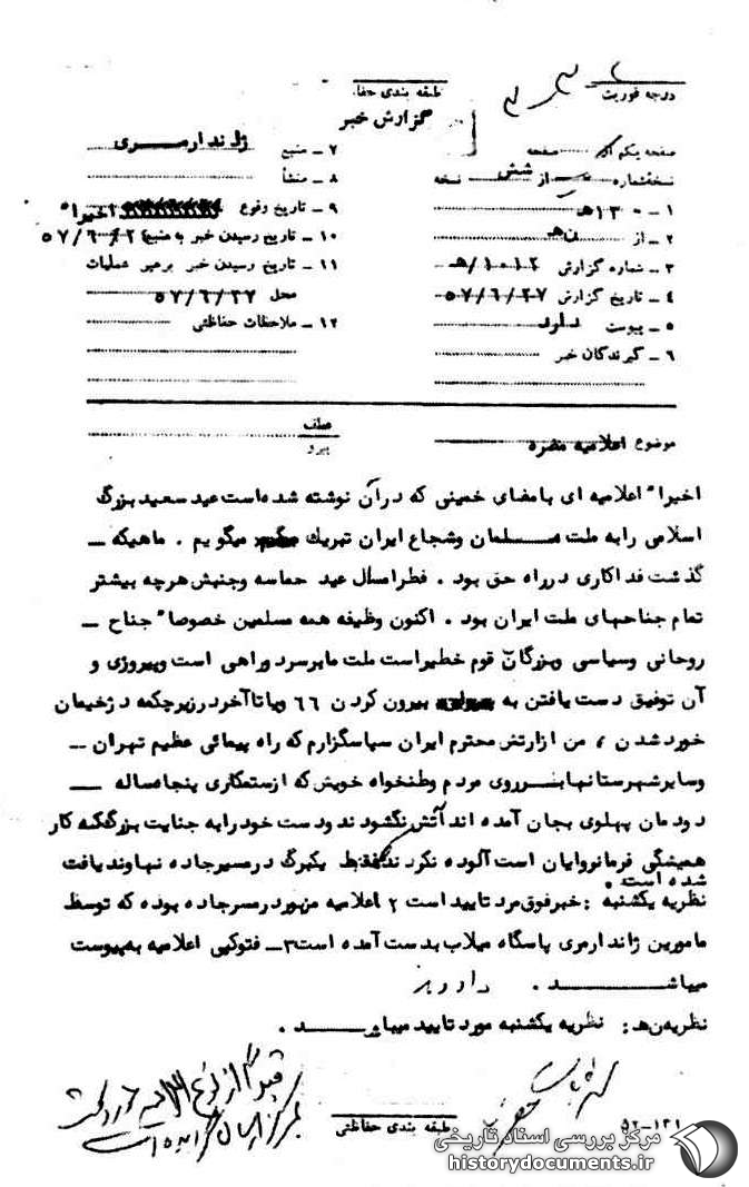اخیراً اعلامیهای به امضای خمینی که در آن نوشته شده است عید سعید بزگ اسلامی را به ملت مسلمان و شجاع ایران تبریک میگویم. ماهی که گذشت فداکاری در راه حق بود. فطر امسال عید حماسه و جنبش هرچه بیشتر تمام جناحهای ملت ایران بود. اکنون وظیفه همه مسلمین خصوصاً جناح روحانی و سیاسی و بزرگان قوم خطیر است ملت ما بر سر دو راهی است و پیروزی و آن توفیق دست یافتن به بیرون کردن 66 و یا تا آخر در زیر چکمه دژخیمان خورد شدن است. من از ارتش محترم ایران سپاسگزارم که راهپیمایی عظیم تهران و سایر شهرستانها بر روی مردم وطنخواه خویش که از ستمکاری پنجاه ساله دودمان پهلوی به جان آمدهاند آتش نگشودند و دست خود را به جنایت بزرگ که کار همیشگی فرمانروایان است آلوده نکردند فقط یکبرگ در مسیر جاده نهاوند یافت شده است.
