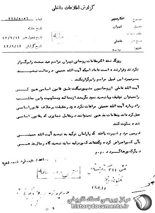 آیتالله عاملی [آملی] از روحانیون مشهور میگفت: طبق قانون اساسی هیچ کس را نمیتوان توقیف و یا تبعید نمود، مگر بعد از محاکمه و محکومیت و این مطلب را درباره آیتالله خمینی مراعات نکرده و در حقیقت برخلاف قانون اساسی عمل کردهاند و مقامات مذهبی نمیتوانند در مقابل تجاوزی که به قانون اساسی شده سکوت کنند.