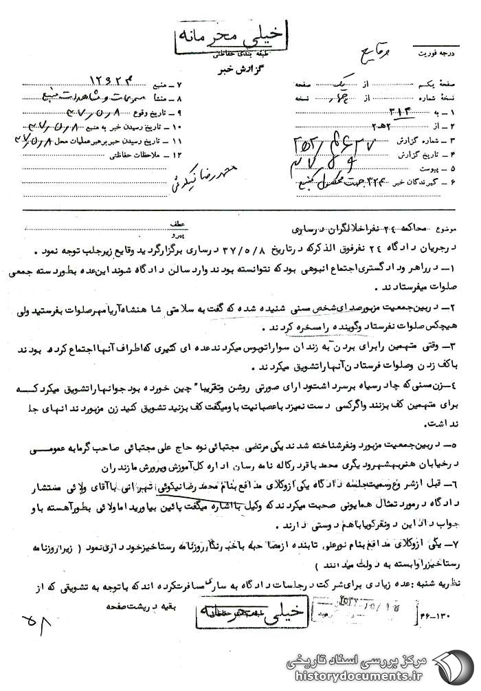در جریان دادگاه 24 نفر فوقالذکر1 که در تاریخ 8 /5 /37 در ساری برگزار گردید وقایع زیر جلب توجه نمود.