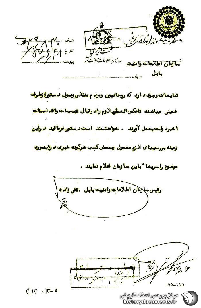 شایعات وجود دارد که روحانیون و مردم منتظر وصول دستور از طرف خمینی میباشند تا عکسالعمل لازم را در قبال تصمیمات و اقدامات اخیر دولت به عمل آورند. خواهشمند است دستور فرمائید در این زمینه بررسیهای لازم معمول و به محض کسب هرگونه خبری در این مورد موضوع را سریعاً به این سازمان اعلام نمایند.