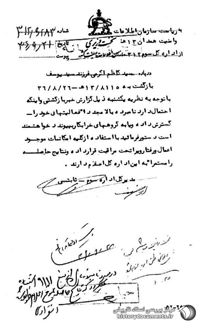 با توجه به نظریه یکشنبه ذیل گزارش خبر بازگشتی و اینکه احتمال دارد نامبرده بالا مجدداً فعالیتهای خود را گسترش داده و یا به گروههای خرابکاری بپیوندد خواهشمند است دستور فرمائید با استفاده از کلیه امکانات موجود اعمال و رفتار وی را تحت مراقبت قرار داده و نتایج حاصله را مستمراً به این اداره کل اعلام دارند.