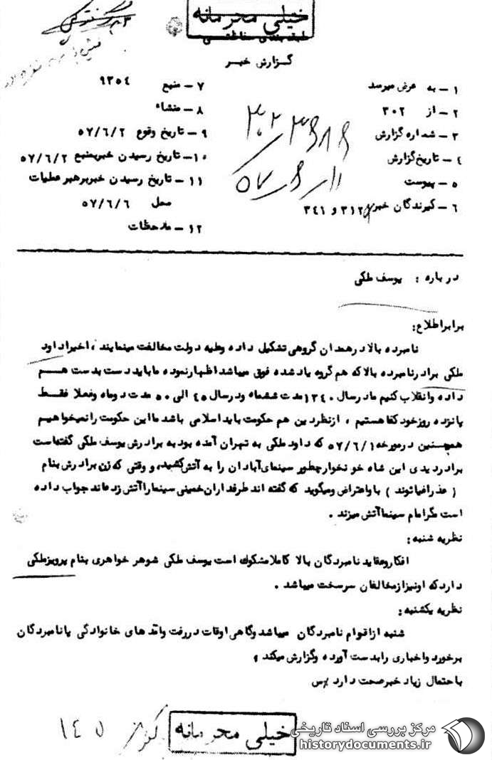برابر اطلاع: نامبرده بالا در همدان گروهی تشکیل داده و علیه دولت مخالفت مینمایند، اخیراً داود ملکی برادر نامبرده بالا که هم گروه یاد شده فوق میباشد اظهار نموده ما باید دست به دست هم داده و انقلاب کنیم ما در سال ۱۳۶۰ مدت شش ماه و در سال 45 الى ۵۰ دو ماه و فعلاً فقط پانزده روز خودکفا هستیم، از نظر دین هم حکومت باید اسلامی باشد ما این حکومت را نمیخواهیم همچنین در مورخه 1 /9 /57 که داود ملکی به تهران آمده بود به برادرش یوسف ملکی گفته است برادر دیدی این شاه خونخوار چطور سینمای آبادان را به آتش کشید و وقتی که زن برادرش به نام (عذرا غیاثوند) به او اعتراض و میگوید که گفتهاند طرفداران خمینی سینما را آتش زدهاند جواب داده است مگر امام سینما را آتش میزند.
