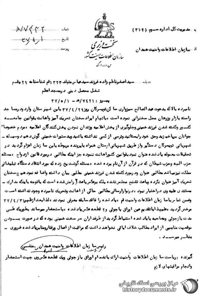نامبرده بالا که به دعوت عبدالصالح سبزواری ساکن تویسرکان روز 29 /4 /37 به این شهرستان وارد و در مساجد راسته بازار وزرهان محل سخنرانی نموده است، به اتهام ایراد سخنان تحریکآمیز و اهانت به قوانین جامعه کشور و کشته شدن فرزند خمینی و جلوگیری از پخش اعلامیه و زندانی نمودن پخش کنندگان اعلامیه، مردم خصوصاً جوانان برپا خیزید و حق خود را بستانید و ترسی از کسی نداشته باشید و به دستورات خمینی گوش دهید وسیله شهربانی تویسرکان دستگیر و از طریق شهربانی استان همراه با پرونده مربوطه به این سازمان اعزام گردید در تحقیقات معموله یاد شده عنوان نمود به قوانین کشور اهانت ننموده جز اینکه مطالبی در مورد قانون ازدواج، مسئله حزبالله و حزب شیطان که در قرآن از آن نام برده شده، مسئله گوشت یخ زده که مورد انتقاد دستگاه تبلیغاتی مملکت نیز میباشد مطالبی عنوان و در مورد کشته شدن فرزند خمینی مطلبی بیان داشته و اضافه نمود هیچ سخنان تحریکآمیز عنوان نکرده و باعث تشنج مجلس نشده بلکه برعکس باعث آرامش شده است که با توجه به اینکه مدارک مستندی علیه وی در اختیار نبود، در نوار ارسالی مطالبی حاکی از اهانت و تحریک نامبره وجود نداشته است و ضمن تماس با سازمان اطلاعات و امنیت قم، یاد شده را فاقد سابقه معرفی نمودند. لذا بعداز ظهر31 /4 /37 مرخص گردید، علیهذا با تقدیم عین اوراق بازجویی و ۲ قطعه عکس یاد شده، به استحضار میرساند به طوری که طی مدت بازجویی و مصاحبه با یاد شده استنباط گردید از طرفداران سرسخت خمینی بوده که در صورت بودن موقعیت مناسبی از ایراد مطالب خلاف ابائی نخواهد داشت که مراقبت از اعمال و رفتار و منابر یاد شده ضروری به نظر میرسد.