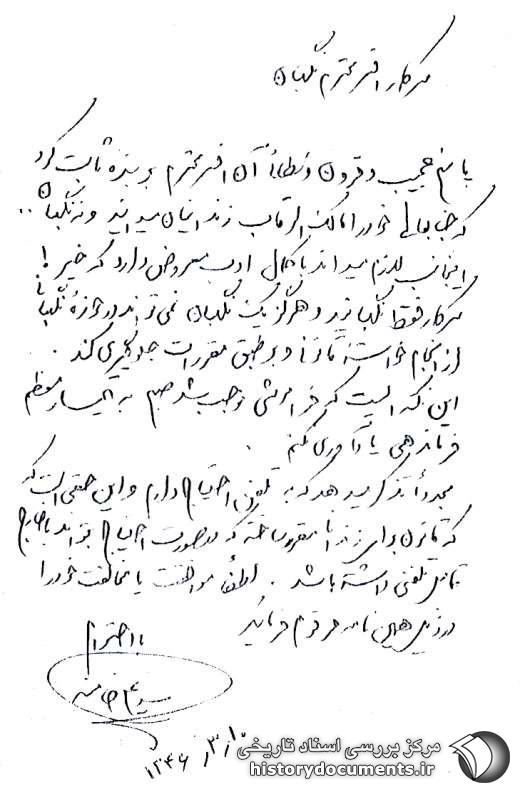 مجدداً تذکر میدهد که به تلفن احتیاج دارم و این حقی است که قانون برای زندانیان مقرر ساخته که در صورت احتیاج بتواند با خارج تماس تلفنی داشته باشد. لطفاً موافقت یا مخالفت خود را در ذیل همین نامه مرقوم فرمایید.
